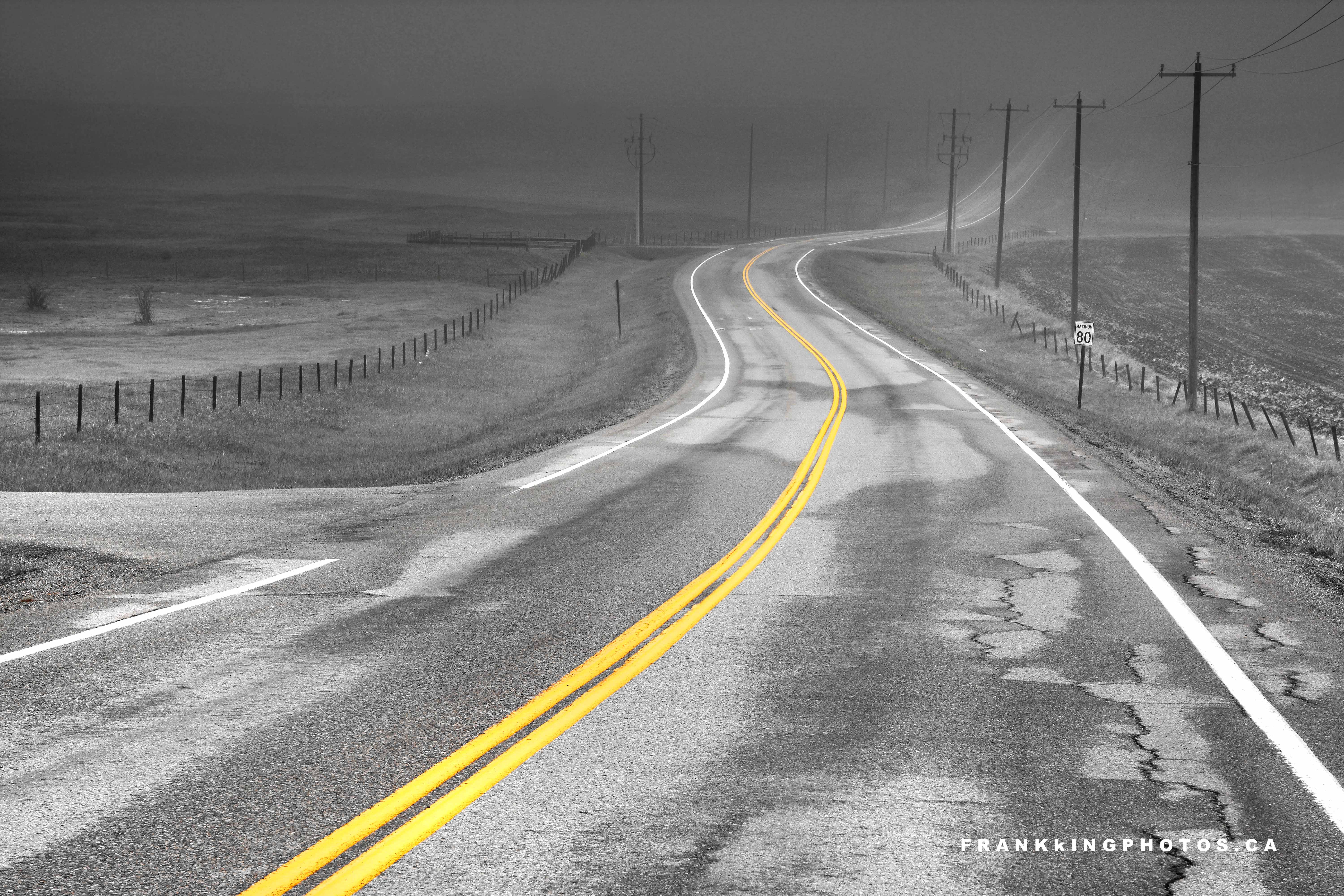 The curve of this prairie road has attracted me and my camera more than once, so when I went searching for images in murky, foggy spring weather, this scene stopped me once again. I used a filter to darken the sky and create a sense of foreboding. Turning everything but the centre lines into black-and-white emphasized the mood I was going for. (That said, you can see the full-colour version here: http://bit.ly/AirdrieRoad.) Nikon D7100, tripod, graduated density (darkening) filter on the sky.