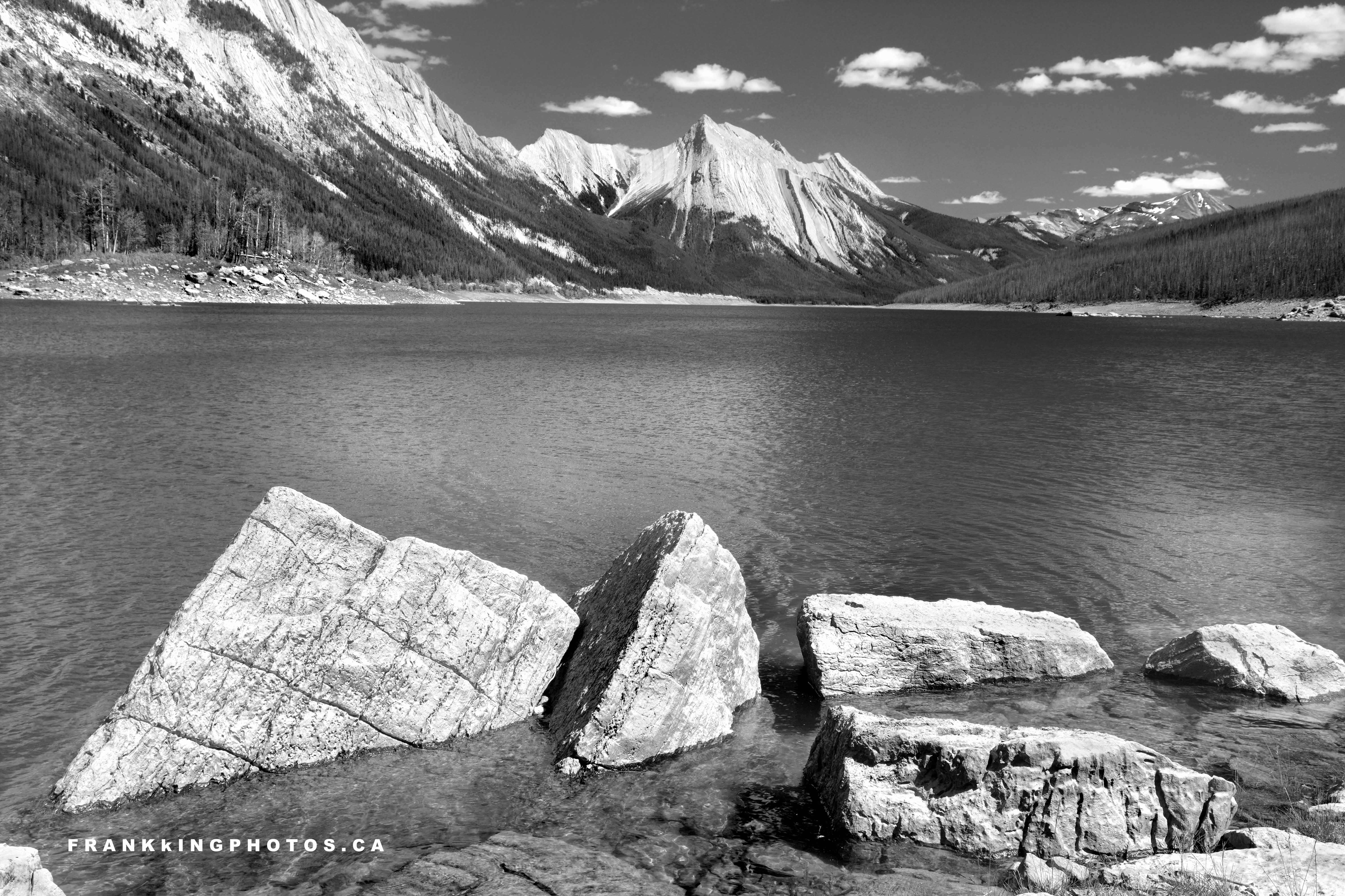 This wonderfully scenic Canadian Rockies water body has ‘lake’ in the title, but according to Wikipedia, it’s not. Instead, it’s an area in which the Maligne River (flowing from Maligne Lake into the Athabasca River) backs up and suddenly disappears underground. During summer months, when meltwater runoff is high, the river overflows. Much like a bathtub that is filled too fast to drain, Medicine ‘lake’ becomes laden with water until it can slowly empty out through a vast underground drainage system. Perhaps that’s more information that you need or want, but I find it fascinating. Indeed, scientists used biodegradable dye to discover the underground drainage system is one of the largest in the world. Very cool! I like the colour version of this picture, but monotone nicely increases the contrast/drama. And deleting colour also removes the evidence of extensive burned trees, all the result of the 2015 Excelsior Wildfire. Nikon D7100, tripod, polarizing filter.