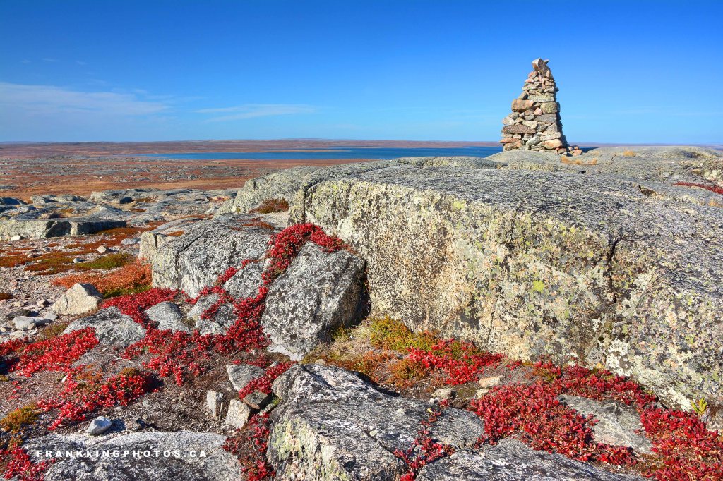 CAIRN AND COLOUR ON THE ARCTIC TUNDRA, NEAR BAKER LAKE, NUNAVUT