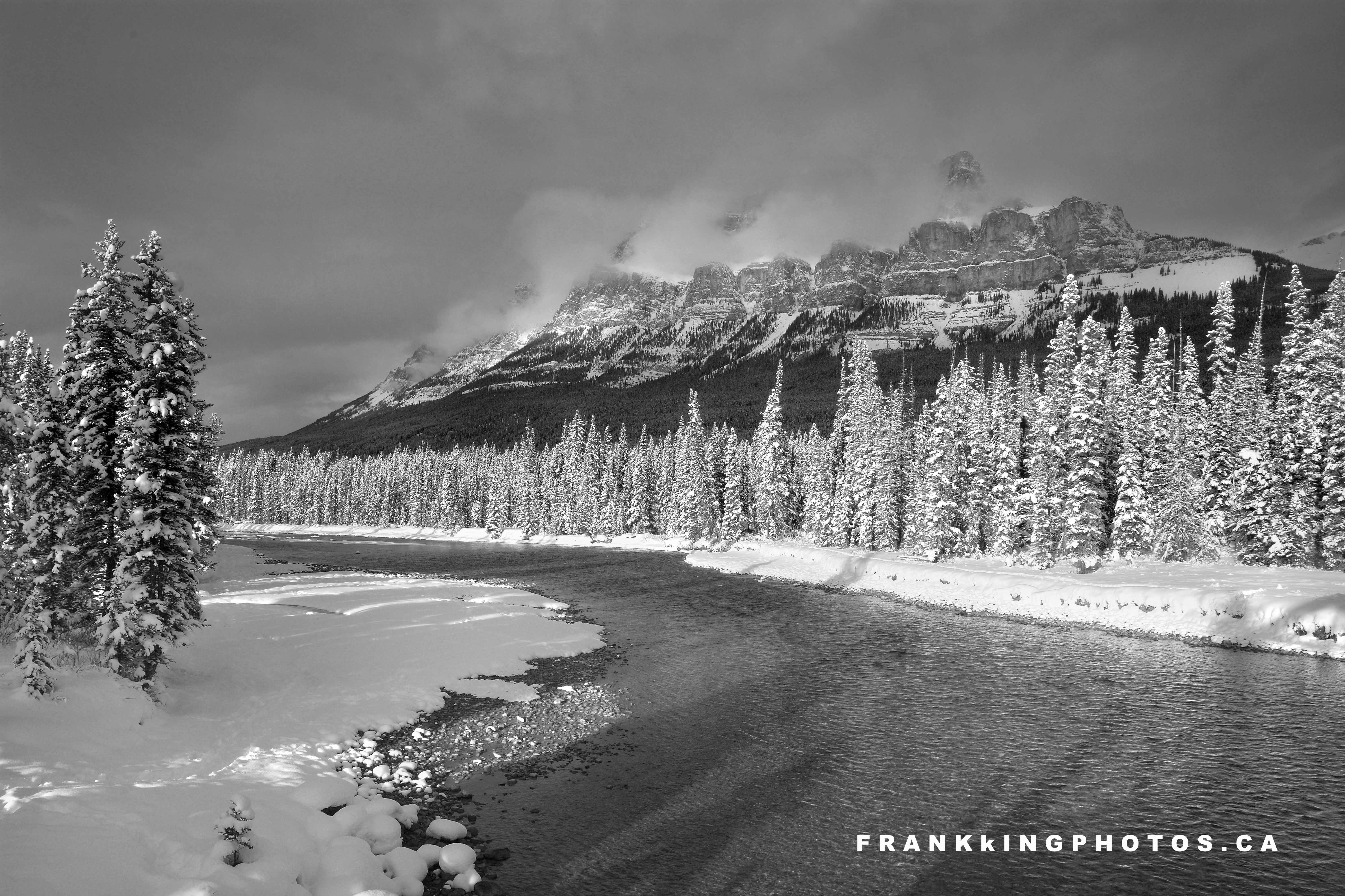 The day had been mostly overcast, but in the last hour, while on the way home, the sun finally found a hole in the clouds and added brilliant illumination to this stunning Canadian Rocky Mountain scene. There wasn’t a lot of colour, so it was an easy decision to show you a black-and-white version – especially as B&W is often more dramatic. (That said, here’s the colour version: https://bit.ly/AlbertaRiver.) Nikon D7100, tripod
