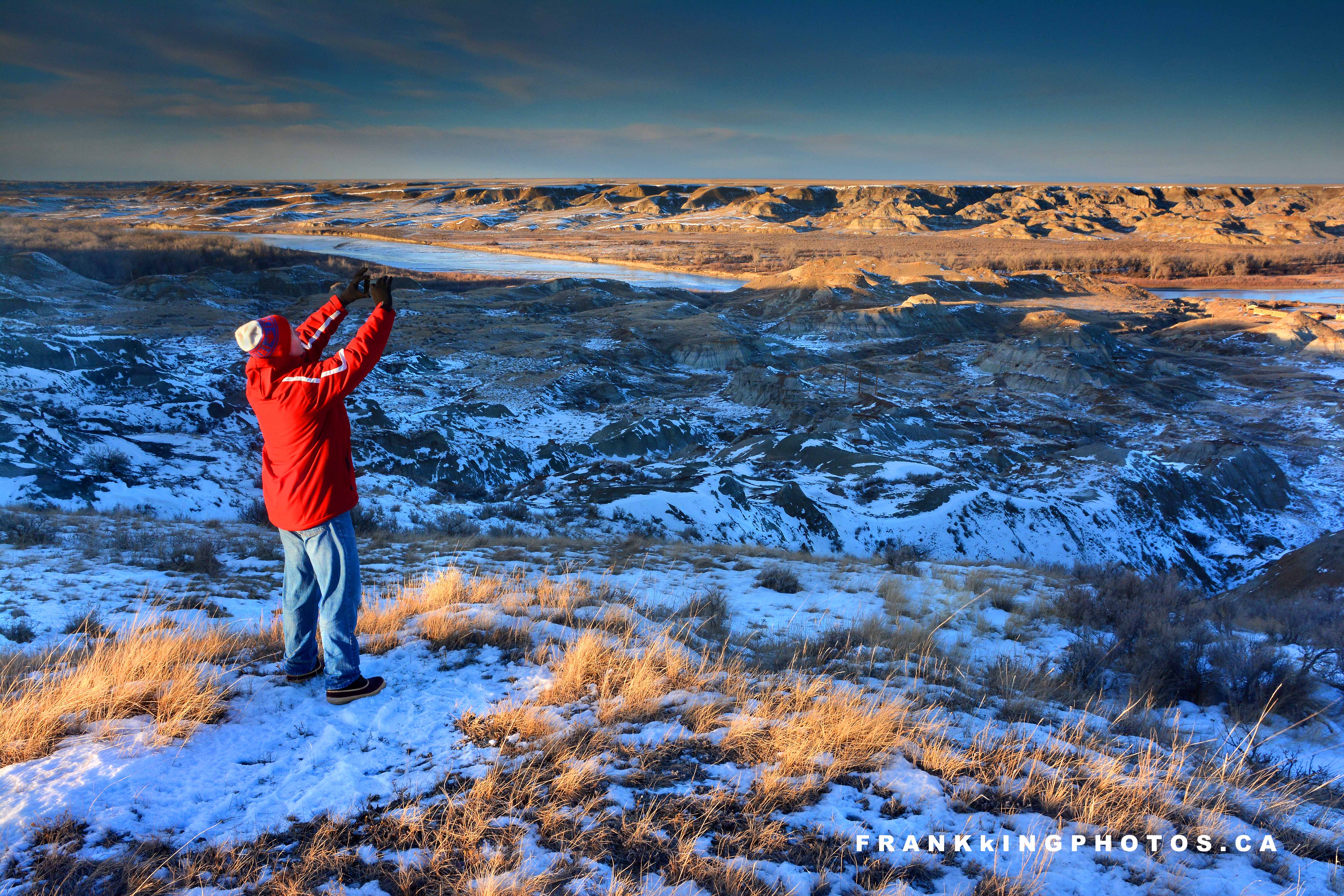 I photographed this astounding mix of badlands and prairies just minutes before the setting sun disappeared behind clouds. Sensing the scene needed a little something extra, I turned on the ‘time exposure’ mechanism and stepped into the scene – first in the centre, then looking into the scene from the left. I like both, but this one seems a little more compelling. That’s the frozen Red Deer River in the distance. Nikon D7100, tripod, polarizing filter, two graduated density (darkening) filters on the sky