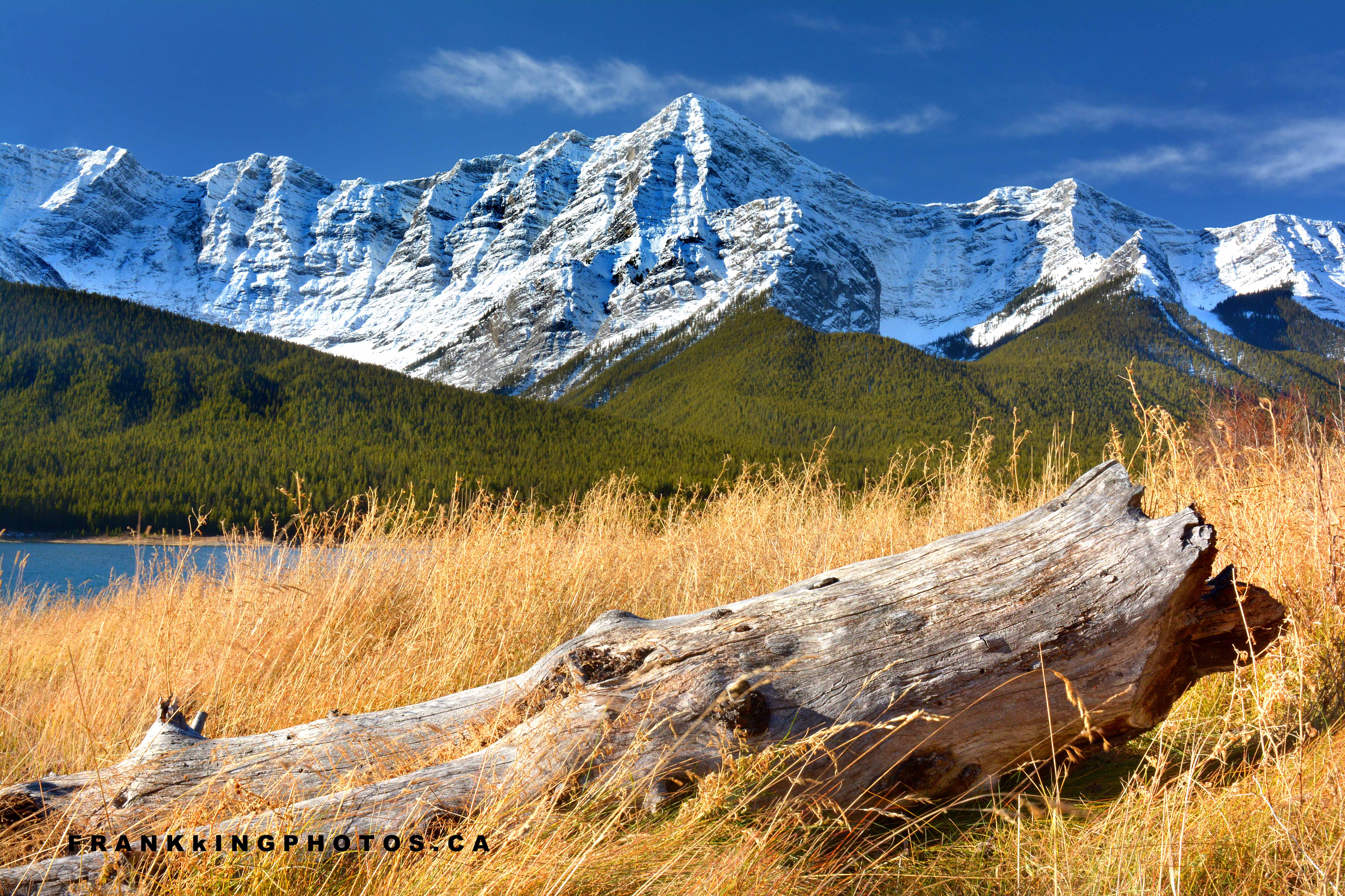 I enjoyed a relatively warm day in the Canadian Rockies, where the snow on the heights had not yet descended into the valleys. As I wandered around the lakeshore, this scene presented itself. I made a strategic decision to arrange the composition to omit the lake (hidden behind the grass) and squeeze the tree trunk against the green forest, winter peaks and blue-bird sky. Nikon D7100, tripod, polarizing filter