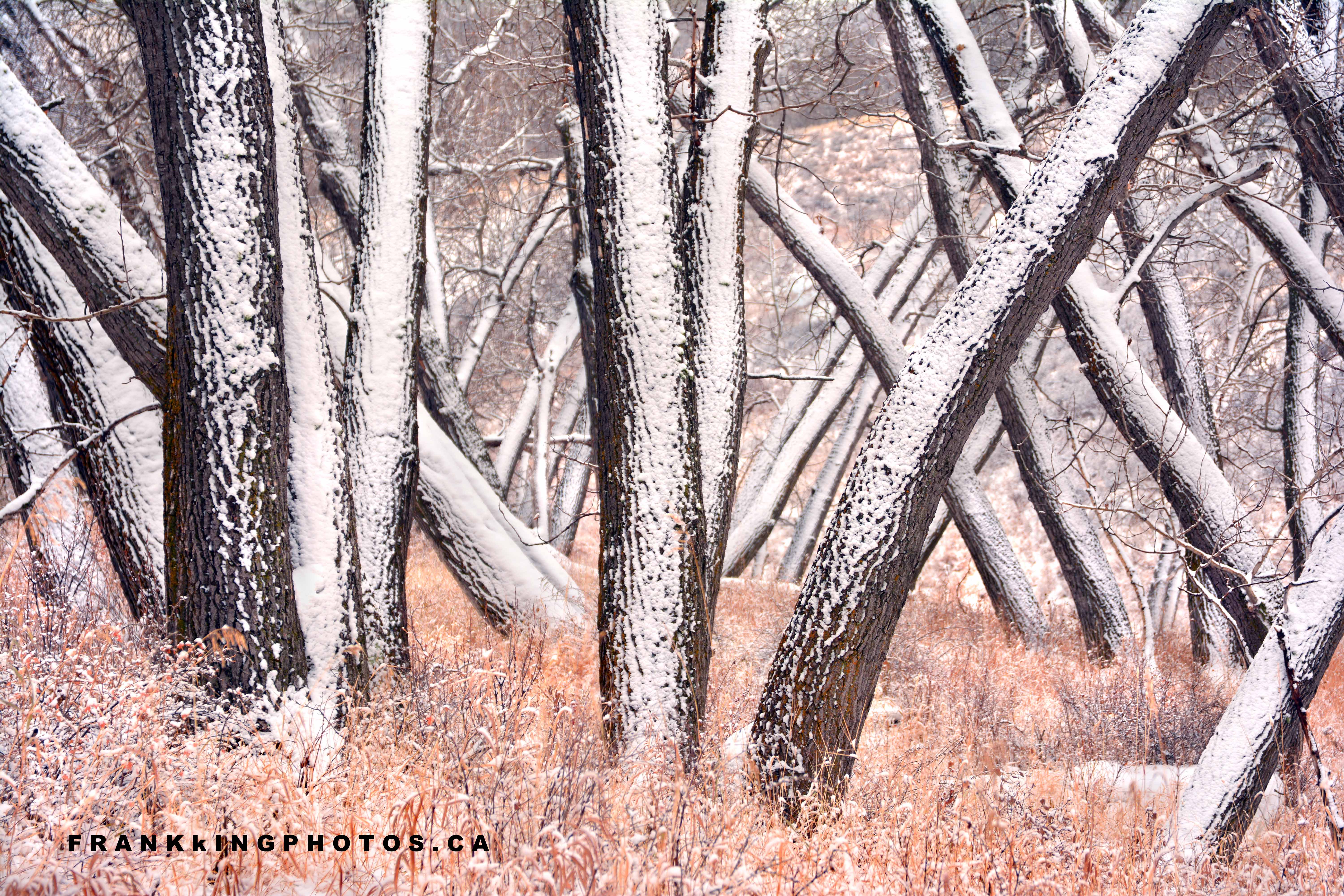 The seemingly random pattern of snowy cottonwood tree trunks grabbed my attention. The trick was to photography them in such a way as to make sense of all the directions of the trunks, and enhance the scene with the wild grass at the bottom. How did I do? PS: this section of forest has a path through it and I tried a photo with me in the scene. Here’s the result: https://wp.me/p2ccTX-10P. Nikon D7100, tripod.