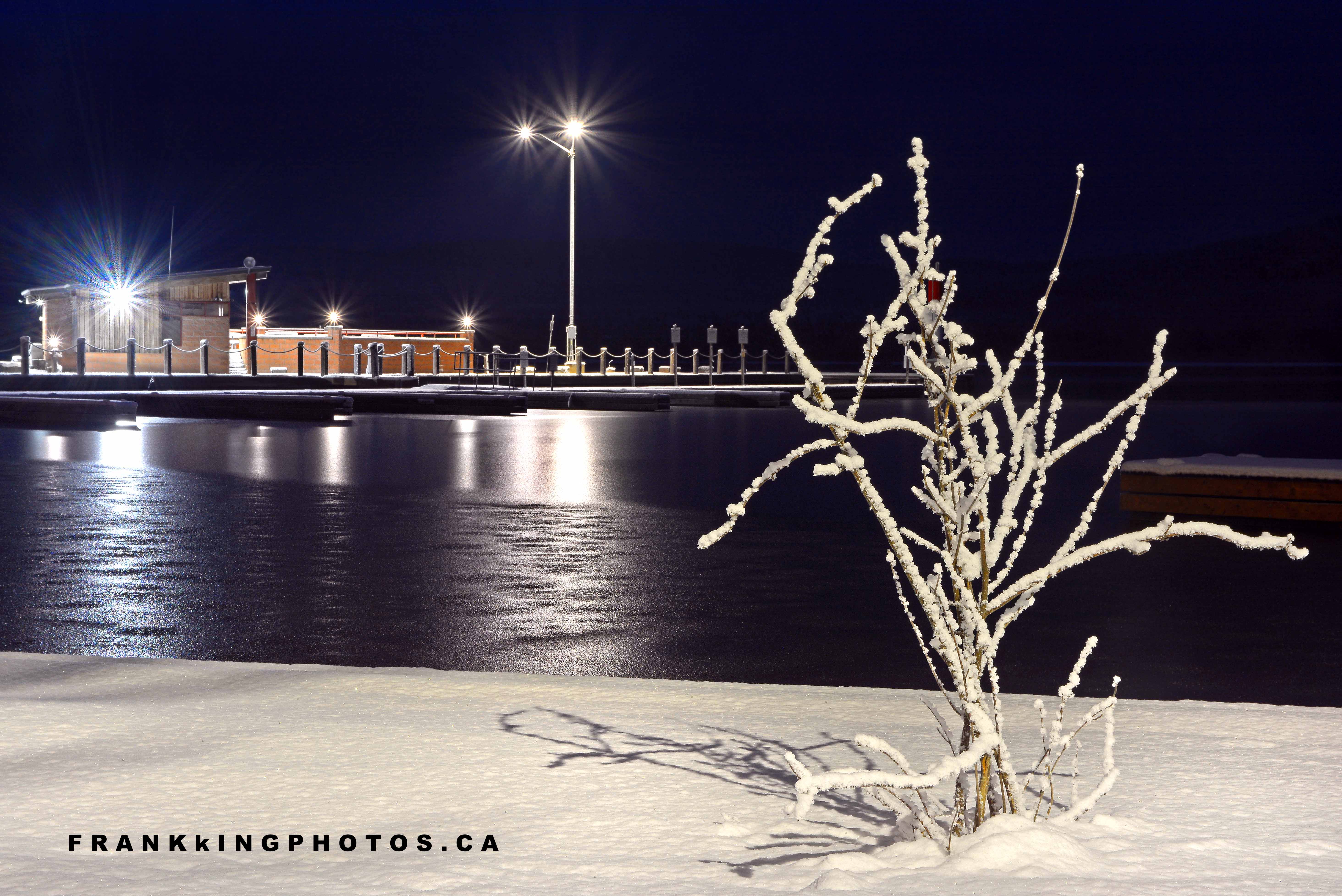 Whenever I visit his eastern Ontario town, the marina always attracts me to try another photo. You can see why here. I was blessed to find this snowy bush – illuminated by a nearby streetlight – to provide balance and a near-far perspective. Then it was just a matter of establishing a long-enough exposure; in this case, 30 seconds! Nikon D7100, tripod, Sigma 17-70-mm lens