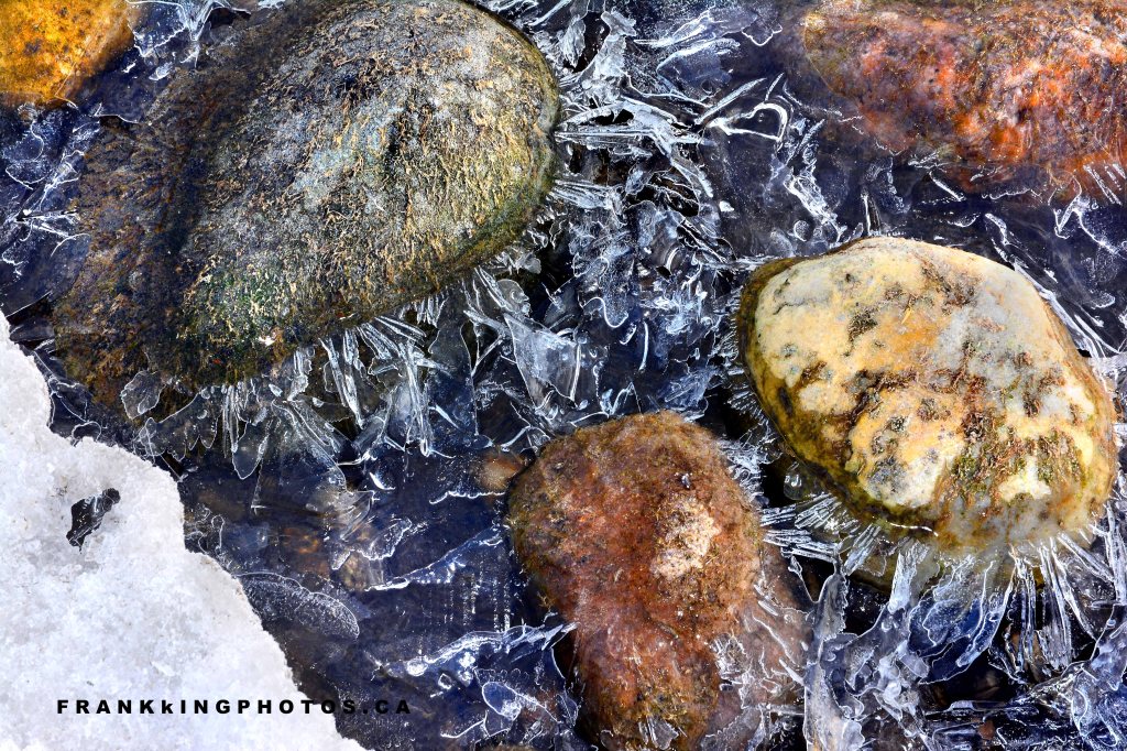 Because of plunging overnight temperatures, spring is often a great time to photograph fascinating patterns of thin, fragile ice. There was plenty to enjoy along the Bow River, so I looked for compelling arrangments with river-worn rock. In this case, I decided to include the receding icy snow that was nearby. Pretty interesting, eh? 🙂