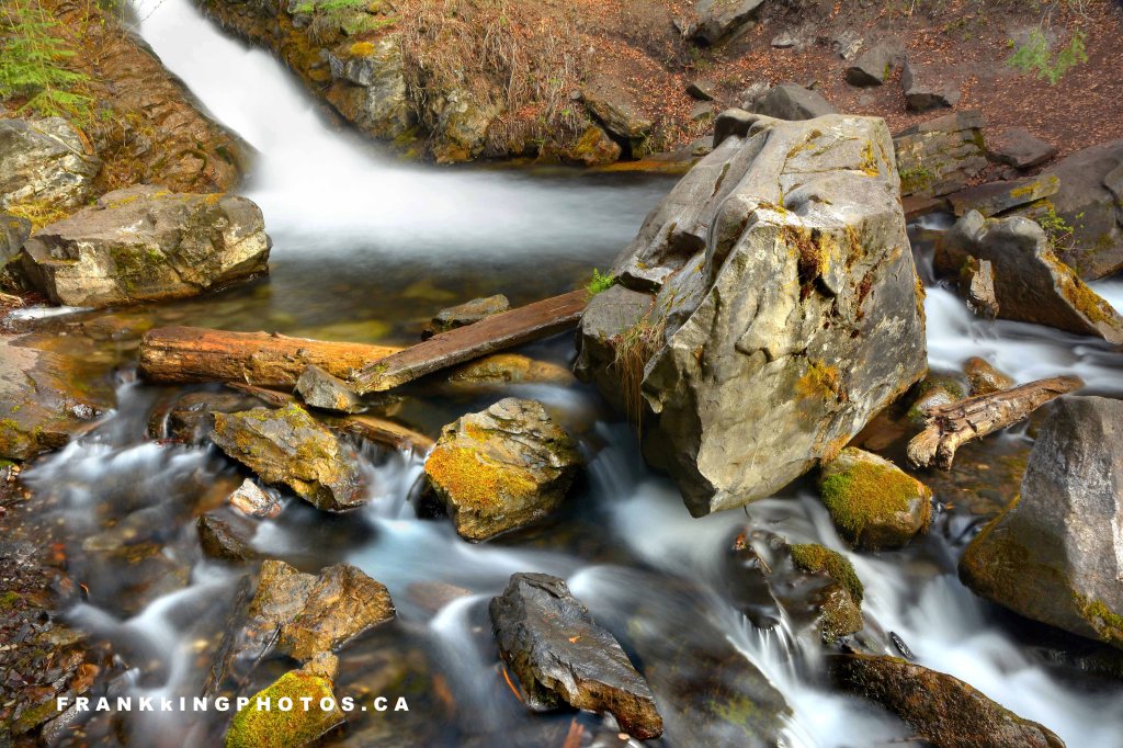 Not sure of the name of this creek and waterfall; all my google searches turned up nothing but “Magic Waterfall” and that sounds like someone just made it up because they didn’t know the real name. Oh well; it’s a beautifully hidden gem above the town of Canmore and I spent several hours of blissful solitude photographing cascades and rocks. This is just one of the “keepers” I came home with. 🙂