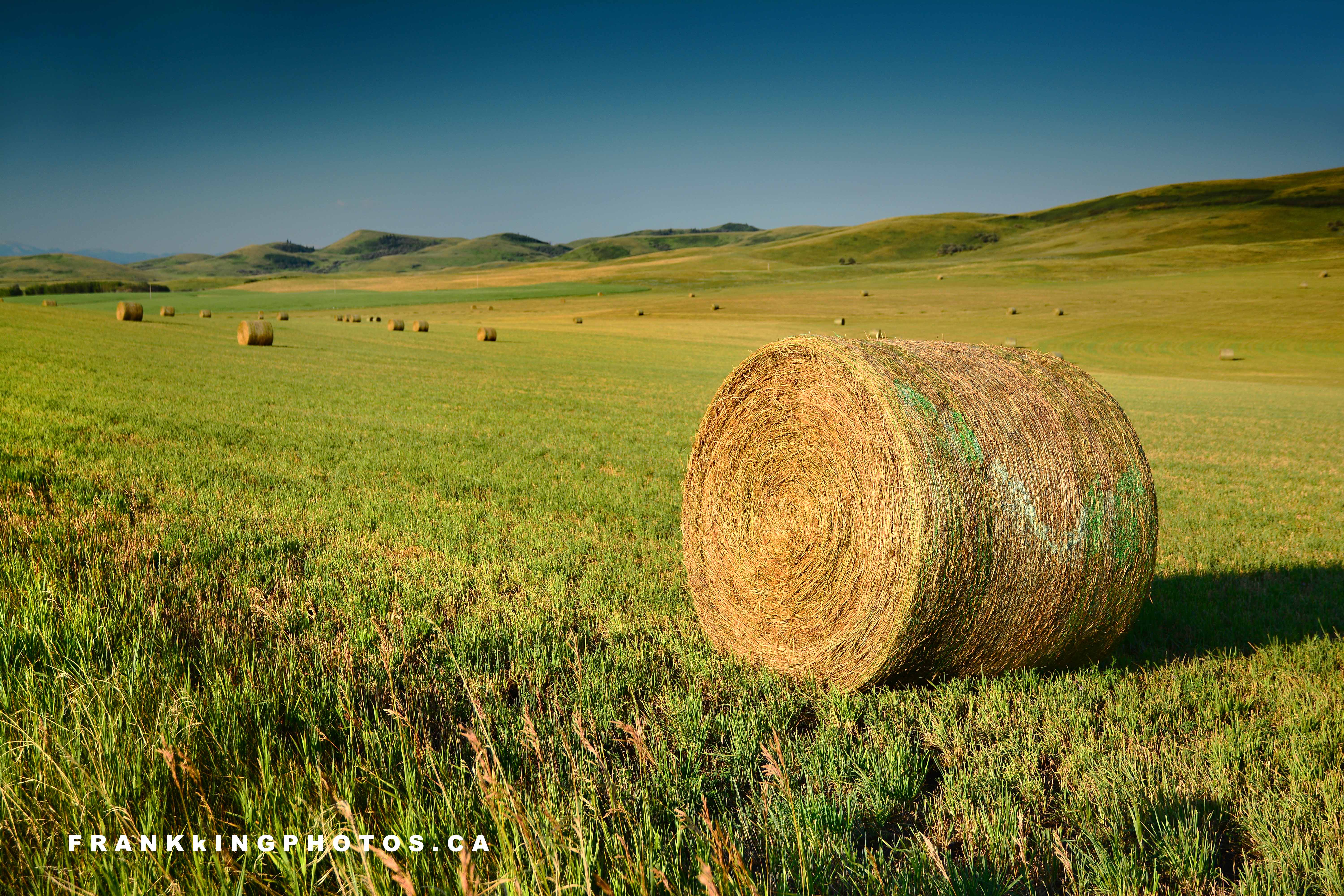 Late July and early August is hay harvest season in this western Canadian province. That always spurs me to grab my photography equipment and drive any old rural road that might lead to restful, beautiful vistas like this. I went for a shallow depth of field on this scene, so the background would complement (rather than compete with) the foreground hay roll. Nikon D7100, tripod, 17-70 mm zoom lens, polarizing filter