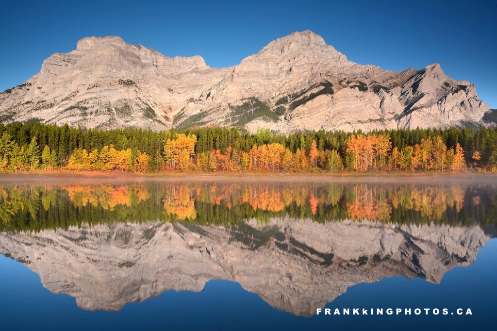 This pond is a mecca for photographers wanting to capture compelling pictures of the Canadian Rocky Mountains. It’s sunken down and surrounded by trees, so it’s often glassy, especially at dawn. This scene was further improved by the hint of mist on the water. Nikon D7100, tripod, enhancing filter, graduated density (darkening) filter on the mountain and sky
