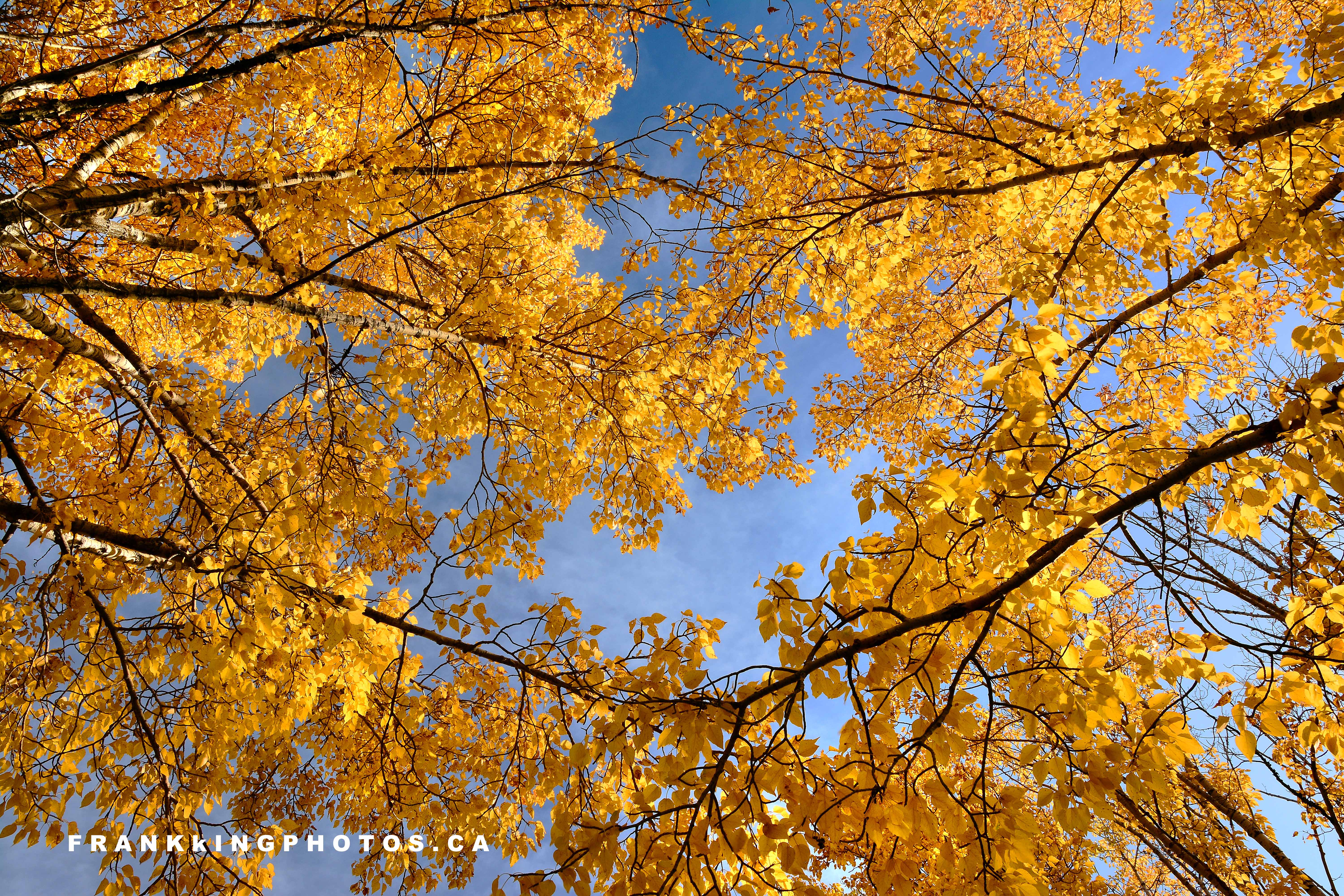 Since it opened in 2011, this park (just west of Calgary) has become a favourite photo locale in every season. Until this year, I hadn’t done a really thorough autumn visit, but that changed this year when I walked about 12,000 steps through aspen groves and along the Bow River. I loved how the branches from several trees seemed to come together in a cathedral of fall yellow and orange. Nikon D7100, tripod, polarizing filter
