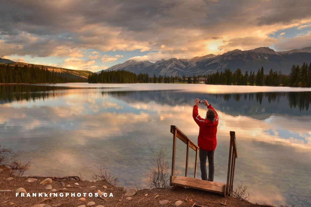 Compelling photo opportunities are pretty much everywhere in this western Canadian park, with many lakes near the town of Jasper itself. This is one of them. I arrived when it was extremely dark and bided my time with some long sky exposures until the light increased enough to make compositions like this. As is often the case, the scene was made more interesting with someone in it; that’s why I almost always wear bright red on my photo trips; it shows up very well if I need to put me in the picture. Nikon D7100, tripod, polarizing filter, graduated density (darkening) filter on the sky