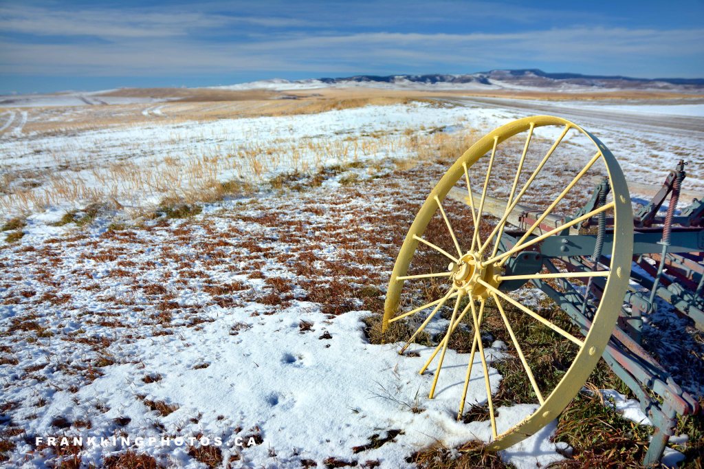 I love old vehicles and farm equipment, so finding this in the midst of a beautiful prairie landscape was a gift. I deliberately went for a shallow depth of field, so the background would complement, rather than compete, with the charming yellow wheel. Dinon D7100, tripod, polarizing filter