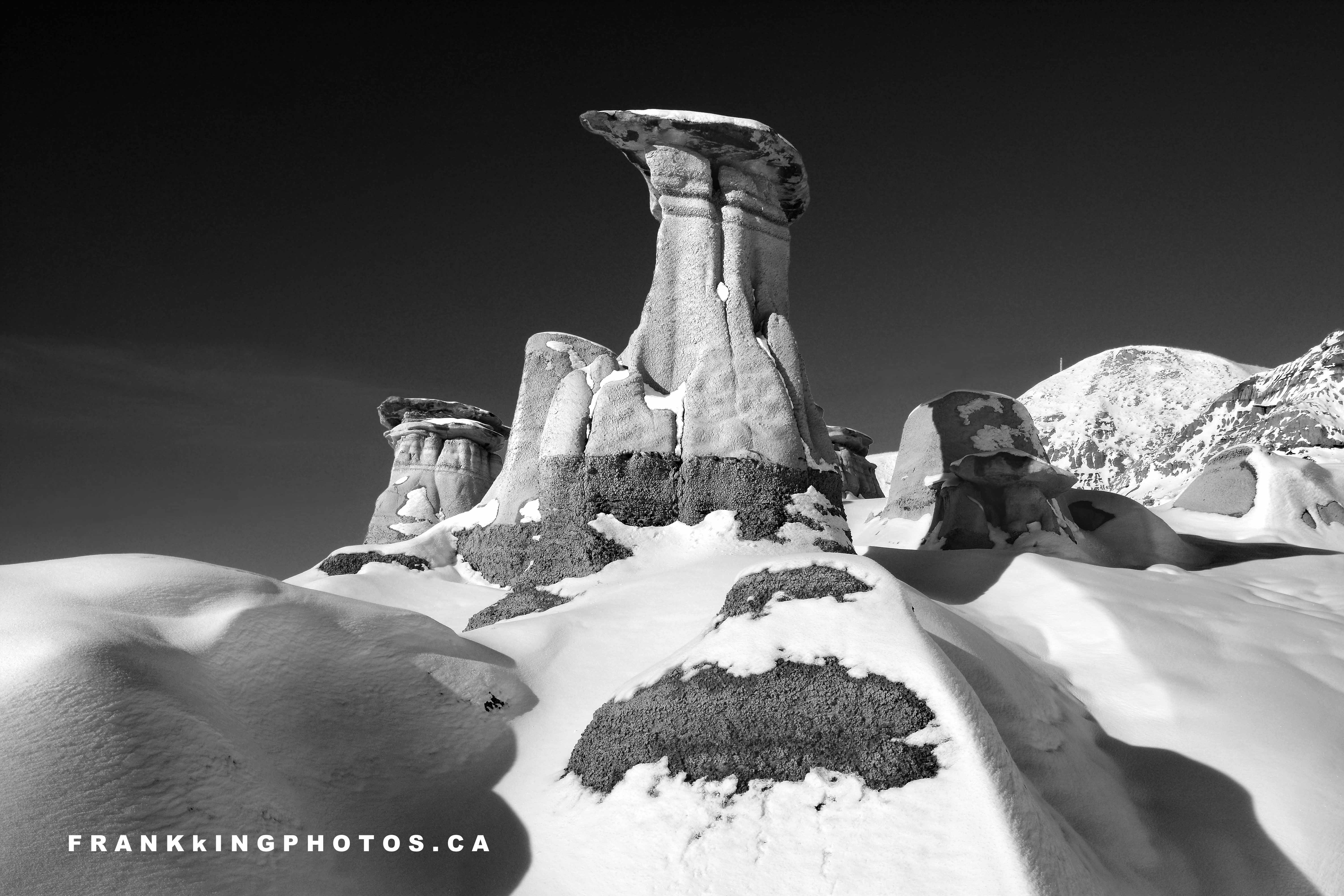 I’m always fascinated by badlands, especially in winter because I know most people have trouble even imagining snow in what is usually a hot and sun-baked landscape. These hoodoos are probably the most photographed scene in the Drumheller region, so I’m glad to show you them in late autumn. I like the colour version (you can see it here: https://bit.ly/DrumhellerHoodoo), but knew it would also make a dramatic and compelling monotone picture. Was I right? Nikon D7100, tripod, polarizing filter