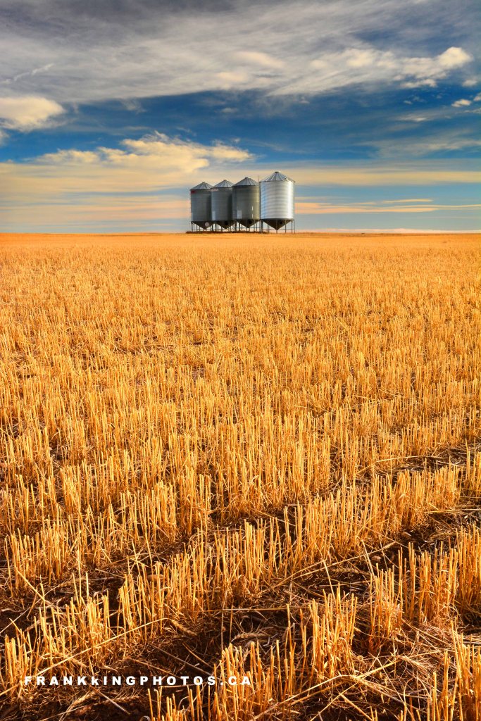 Among the many reasons I love the western Canadian prairies is the minimalist sense of empty openness. That’s what attracted me to this scene. It’s just field, grain bins and gorgeous sky. Nothing else.