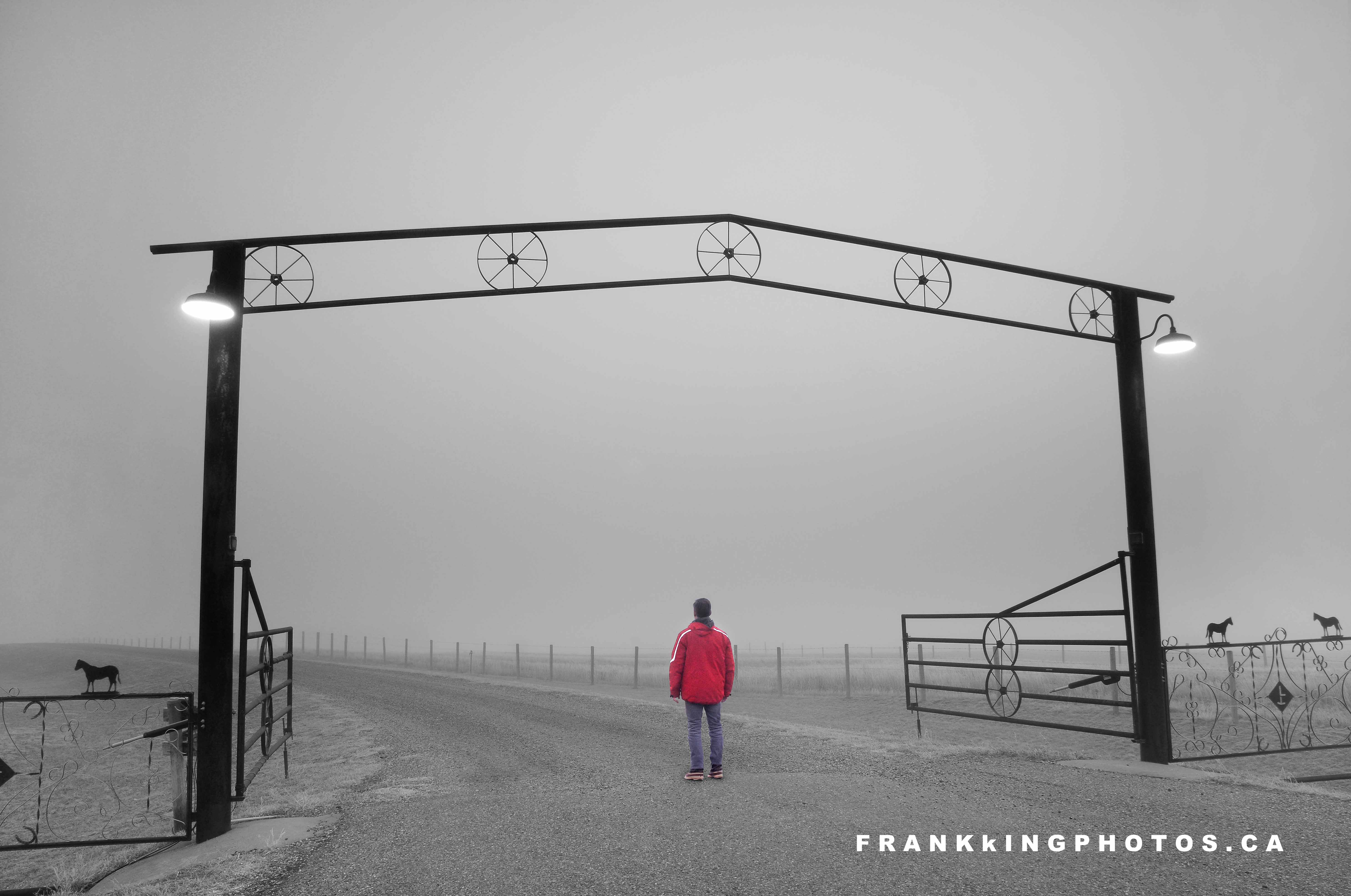 I love making photographs in foggy conditions, but always find it a challenge to find compelling subjects that will photograph well. Just before driving out of the fog, I came across this entrance to a rural ranch in the western Canadian prairies. It needed a person, so I used the camera timer and ran back and forth several times before getting it right.