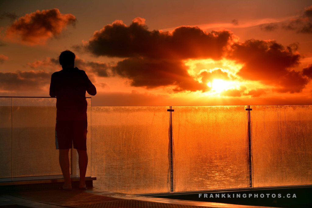Our recent cruise ship vacation gave me plenty of creative opportunities including ones like this, where I captured a solitary figure appreciating the start of a warm new day. I was far enough away to ensure he never knew he was being photographed.