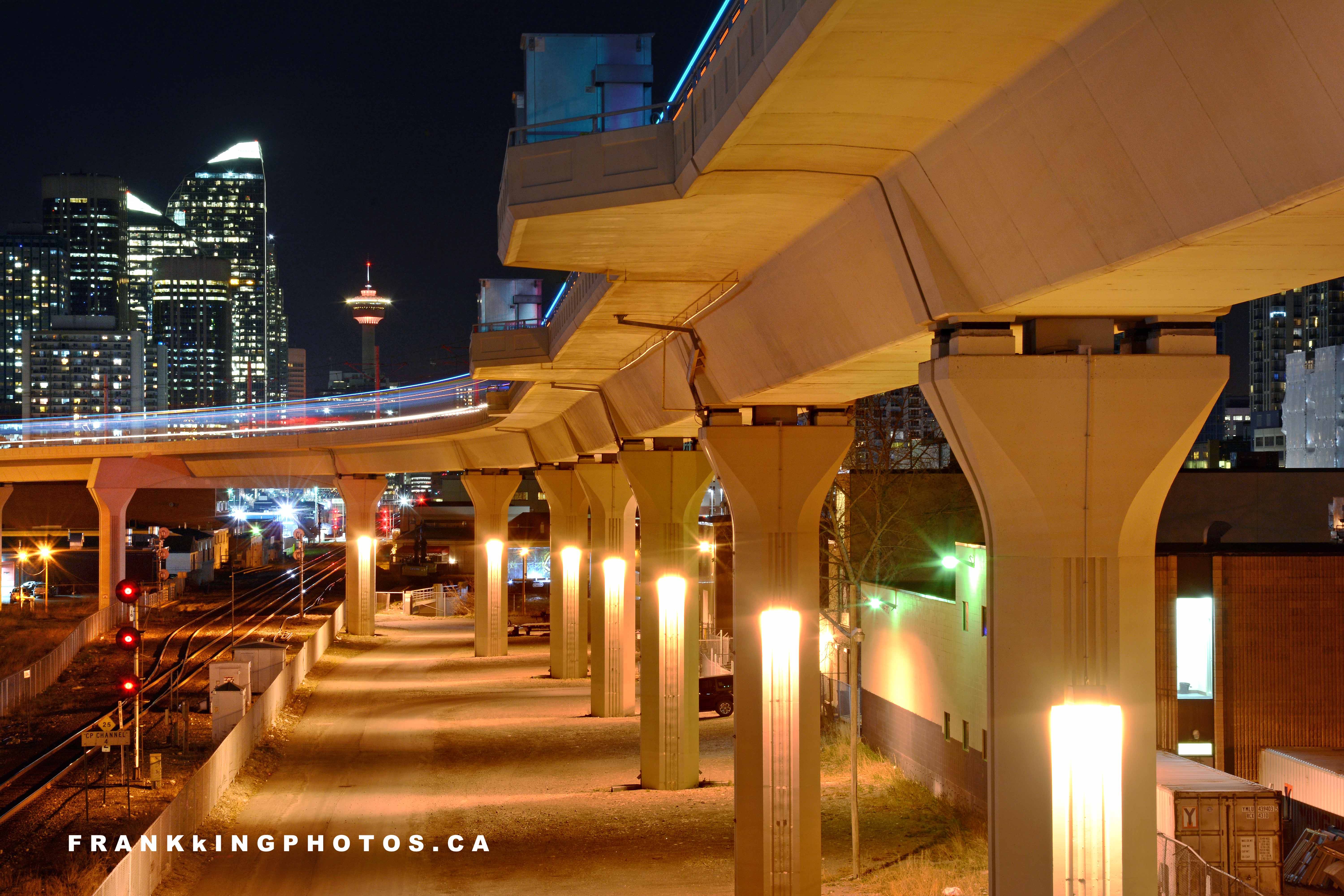 In this western Canadian city, the light rapid transit system is called the “C-Train”. This raised section goes through the Sunalta station and I found a very useful high viewpoint to capture it at night. Look carefully and you’ll see the 25-second exposure of a train’s light trail as it travels the track. Nikon D7100, tripod