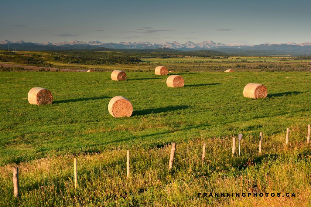 HAY ROLLS AND DISTANT MOUNTAINS, WEST OF CALGARY, ALBERTA