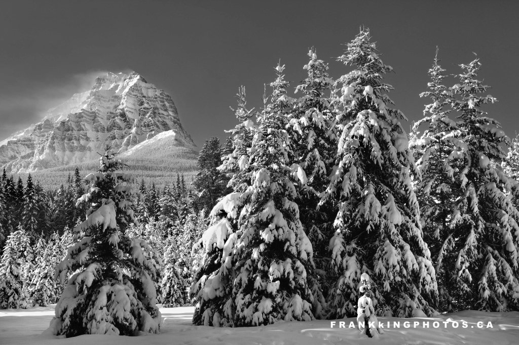 Canada’s Rocky Mountains are always a treat to visit right after a snowfall, especially if the day is sunny. That was the case here, when I found the shadowy trees perfectly framing the snowy peak.