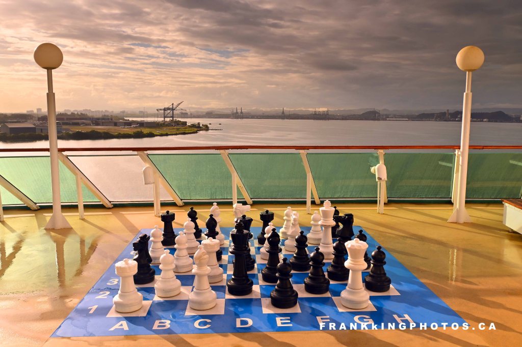 During our 20th anniversary cruise ship vacation, I was up at dawn to wander around the Grandeur of the Sea looking for picture opportunities. This chess set was the perfect subject, especially with the light and interesting sky of a Caribbean sunrise.