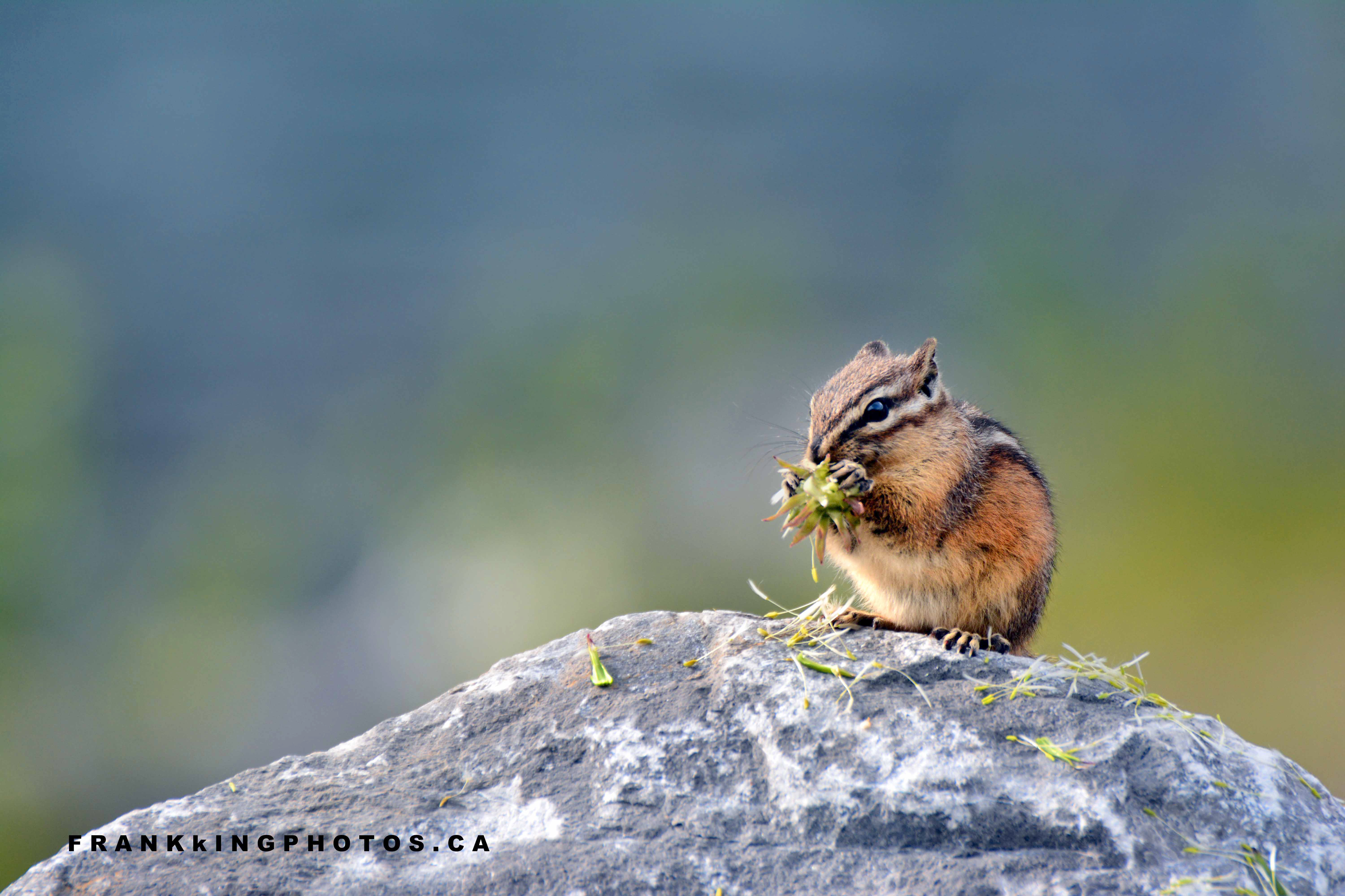 I was photographing the river in this western Canadian province when I couldn’t help but notice these chipmunks perched on various boulders enjoying fresh vegetation, grains and seeds.
