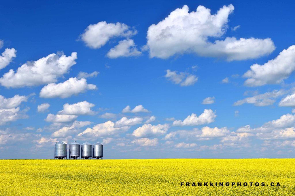CANOLA FIELD AND GRAIN SILOS, ROCKY VIEW COUNTRY, ALBERTA