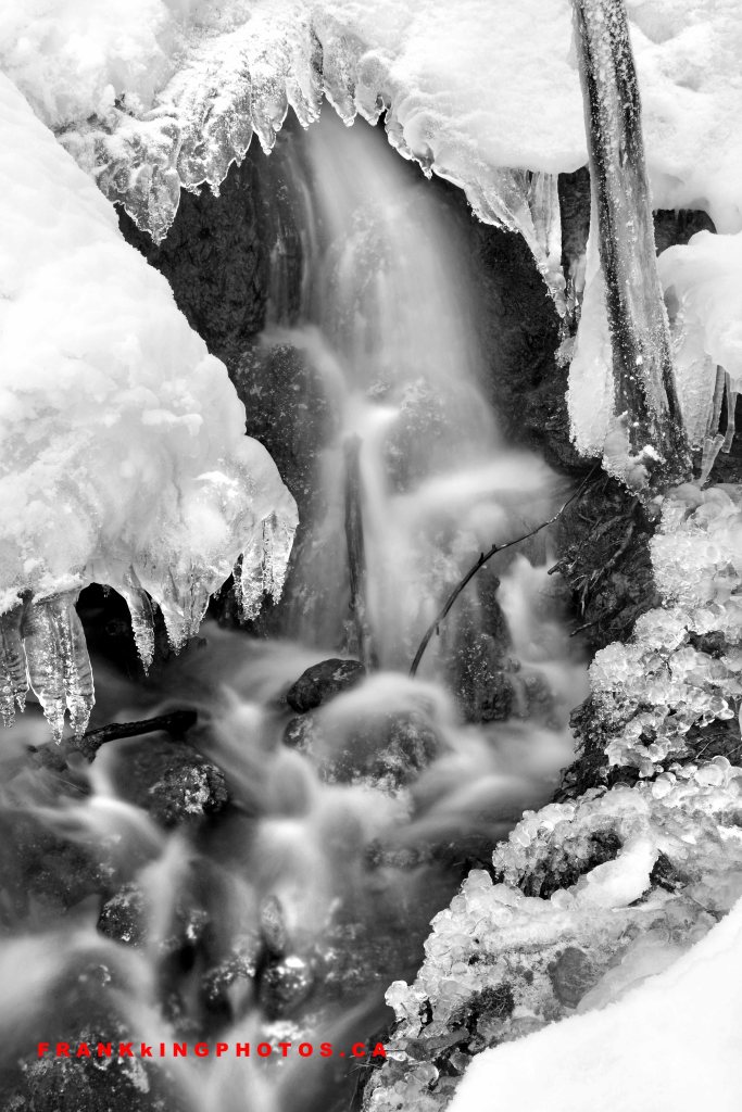 The ice-encrusted opening in this waterfall grabbed my attention; I loved the icy frame for the flowing water, so I went for a long exposure to make the water soft against the sharp edges. There was almost no colour in this scene, so it was a no-brainer to create and show you a monotone version.