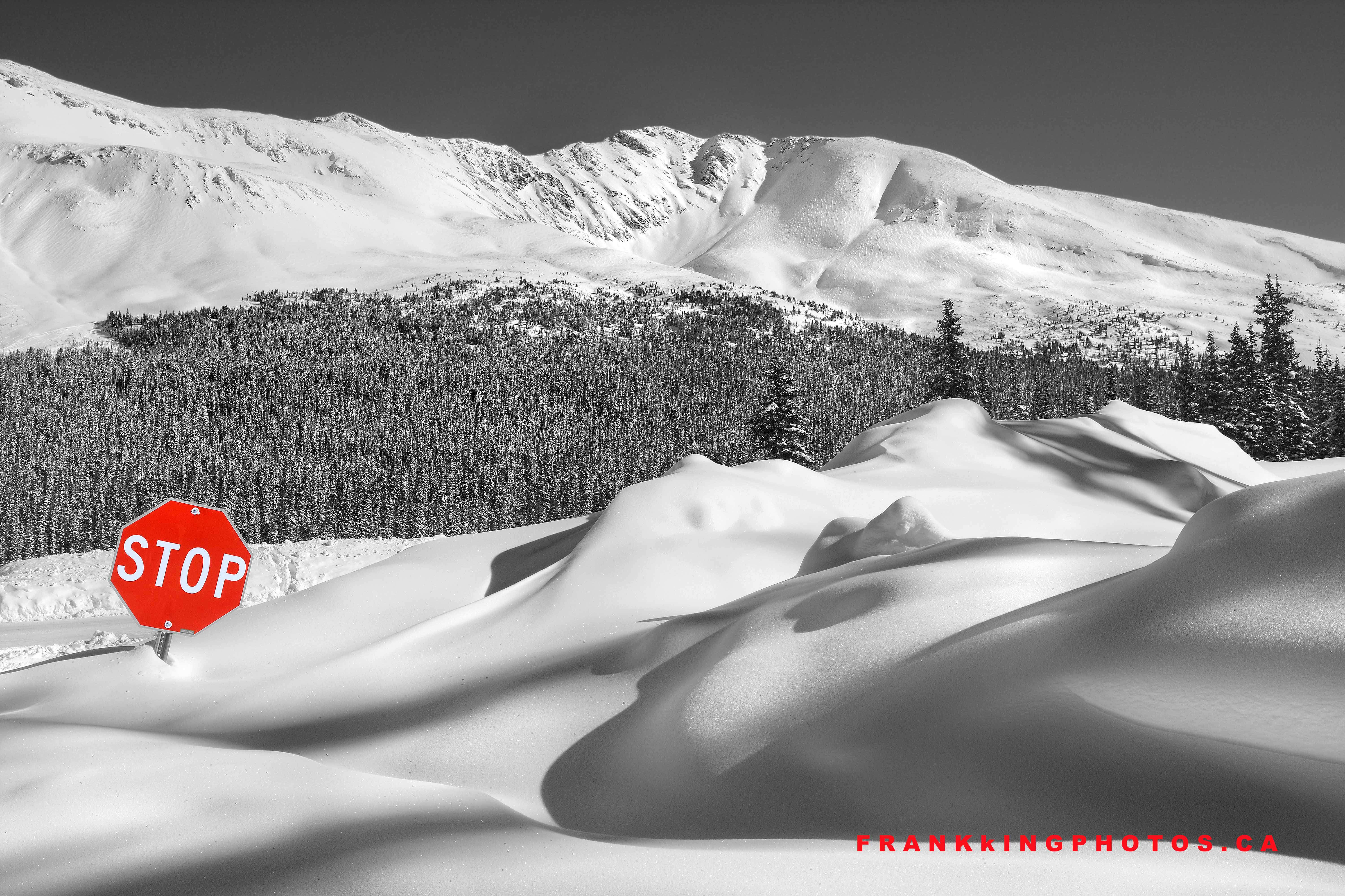 The play of light and shadow grabbed my attention and resulted in a half-hour of exploring the creative possibilities. Stepping back, I saw the amusing juxtaposition of a stop sign in the midst of the snow and it resulted in this picture. The colour picture is pretty cool (you can see it here: https://bit.ly/PeytoSummit ), but I thought keeping the sign in colour, then turning the rest of the photo into monotone would be equally compelling. Do you agree? Nikon D7100, 17-70 mm zoom lens, tripod