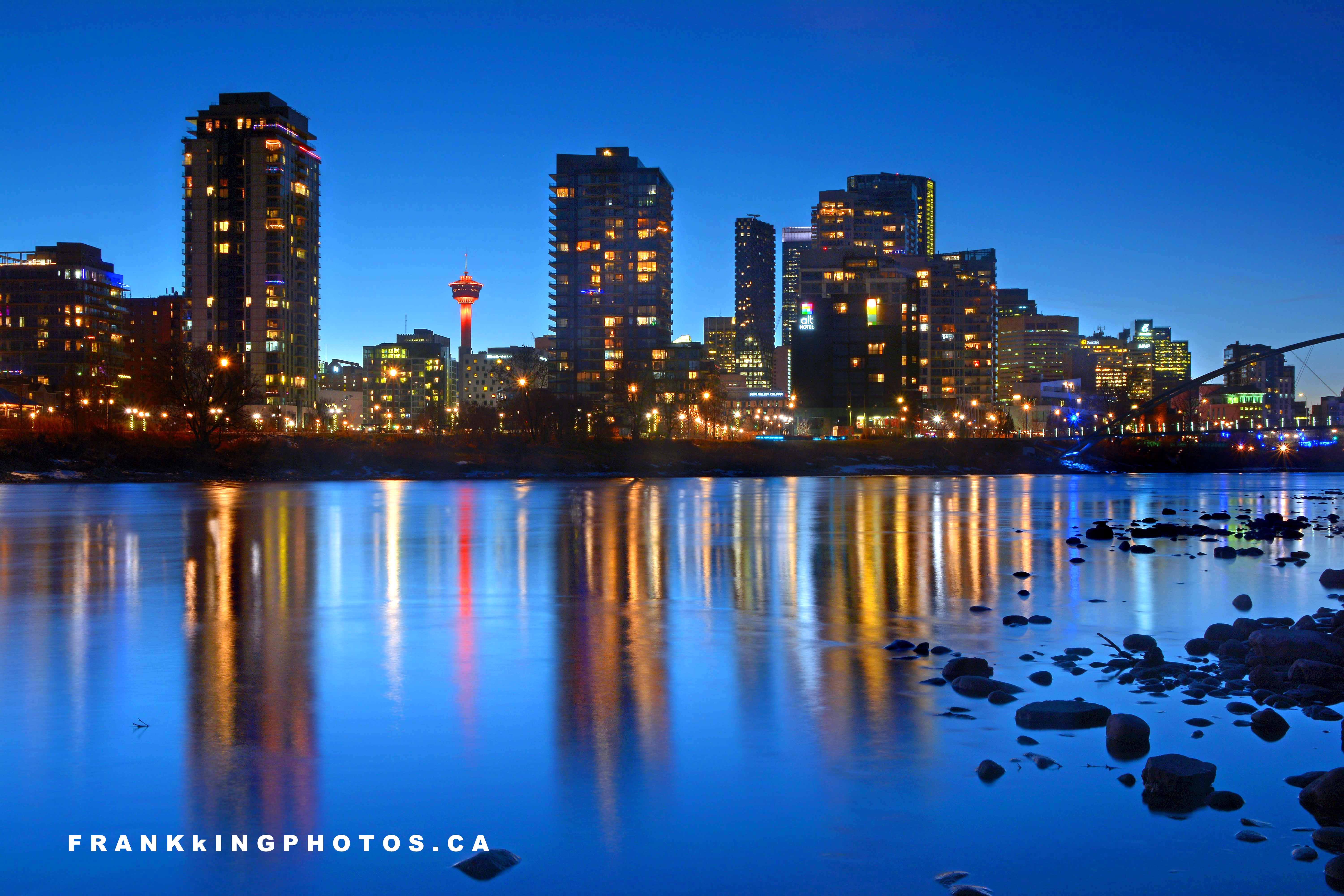 A river definitely runs through this western Canadian city, making for excellent “blue hour” photo opportunities before the river ices over. That was the case here and it was made just a little more special by the plane making a turn during my 30-second exposure.